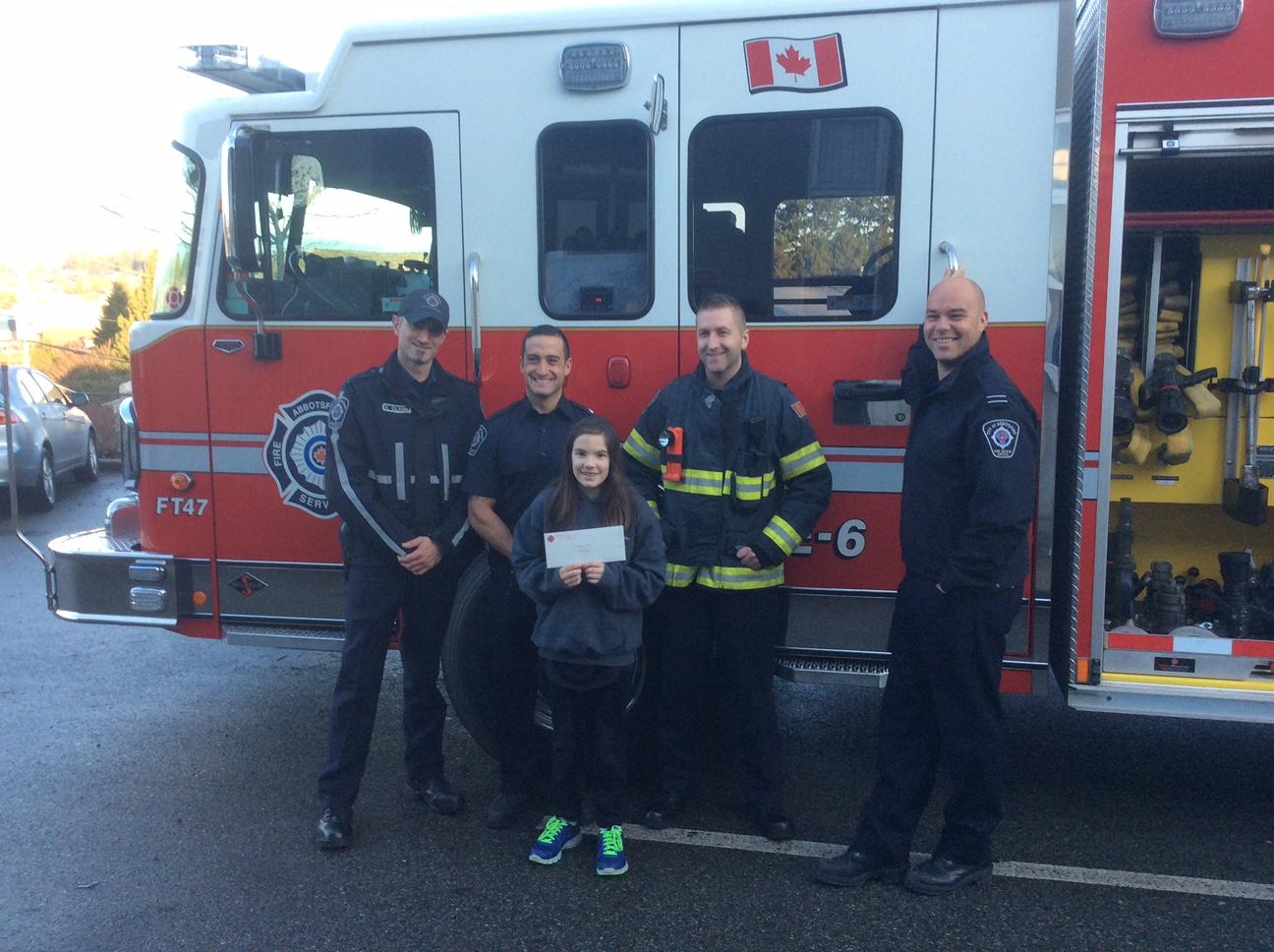 Julianna Church received a $100 cheque, which was presented by Abbotsford fire hall 6 at her school, McMillan Elementary.