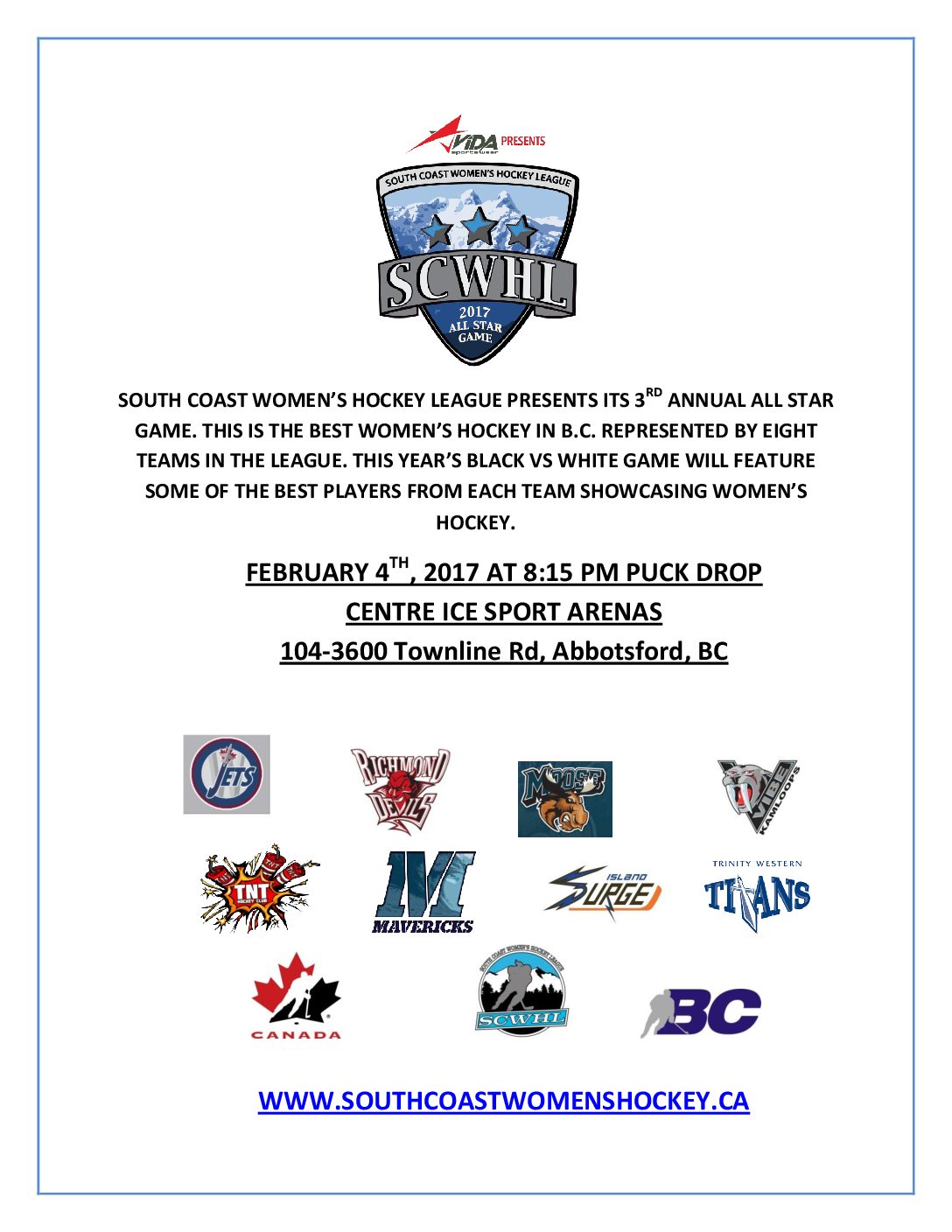 THE SOUTH COAST WOMEN’S HOCKEY LEAGUE PRESENTS ITS 3RD ANNUAL ALL STAR GAME. THIS IS THE BEST WOMEN’S HOCKEY IN B.C. REPRESENTED BY EIGHT TEAMS IN THE LEAGUE. THIS YEAR’S BLACK VS WHITE GAME WILL FEATURE SOME OF THE BEST PLAYERS FROM EACH TEAM SHOWCASING WOMEN’S HOCKEY. FEBRUARY 4TH, 2017 AT 8:15 PM PUCK DROP…